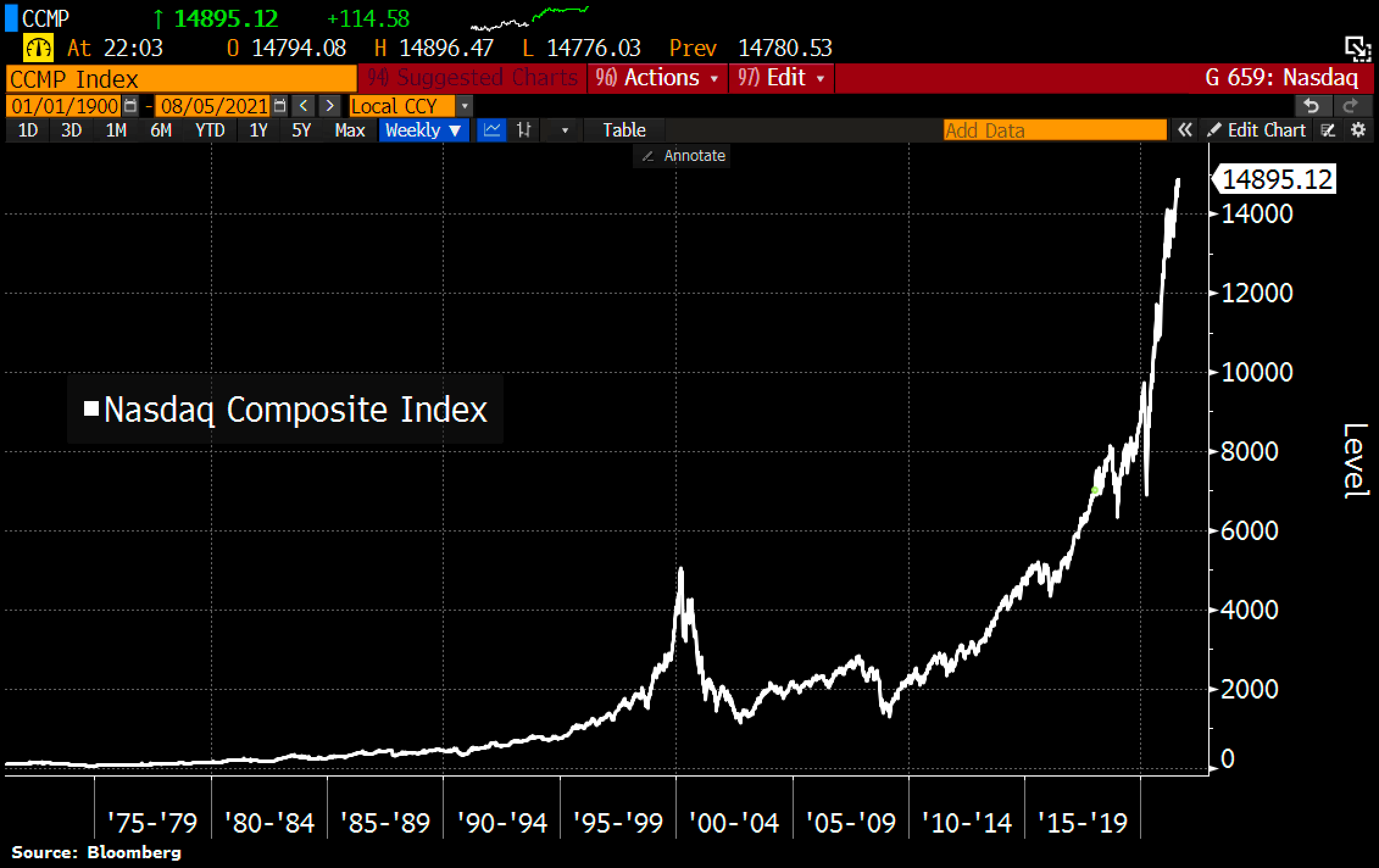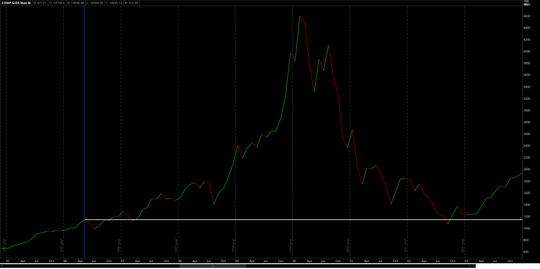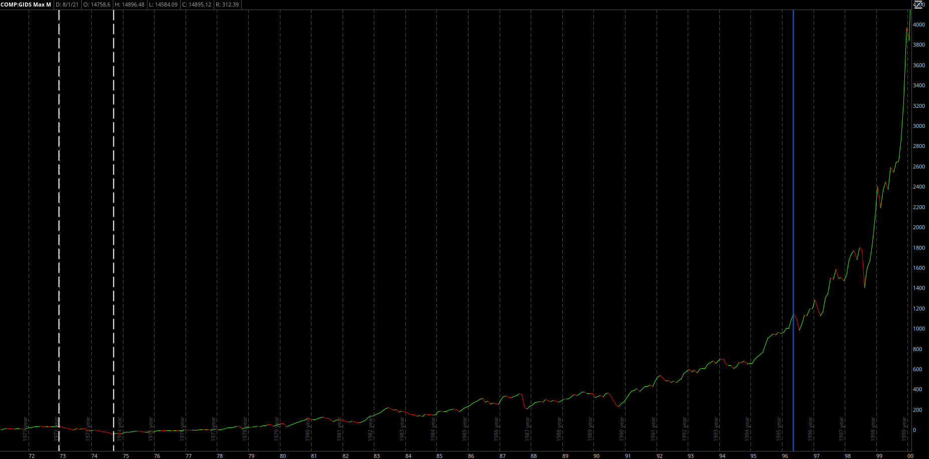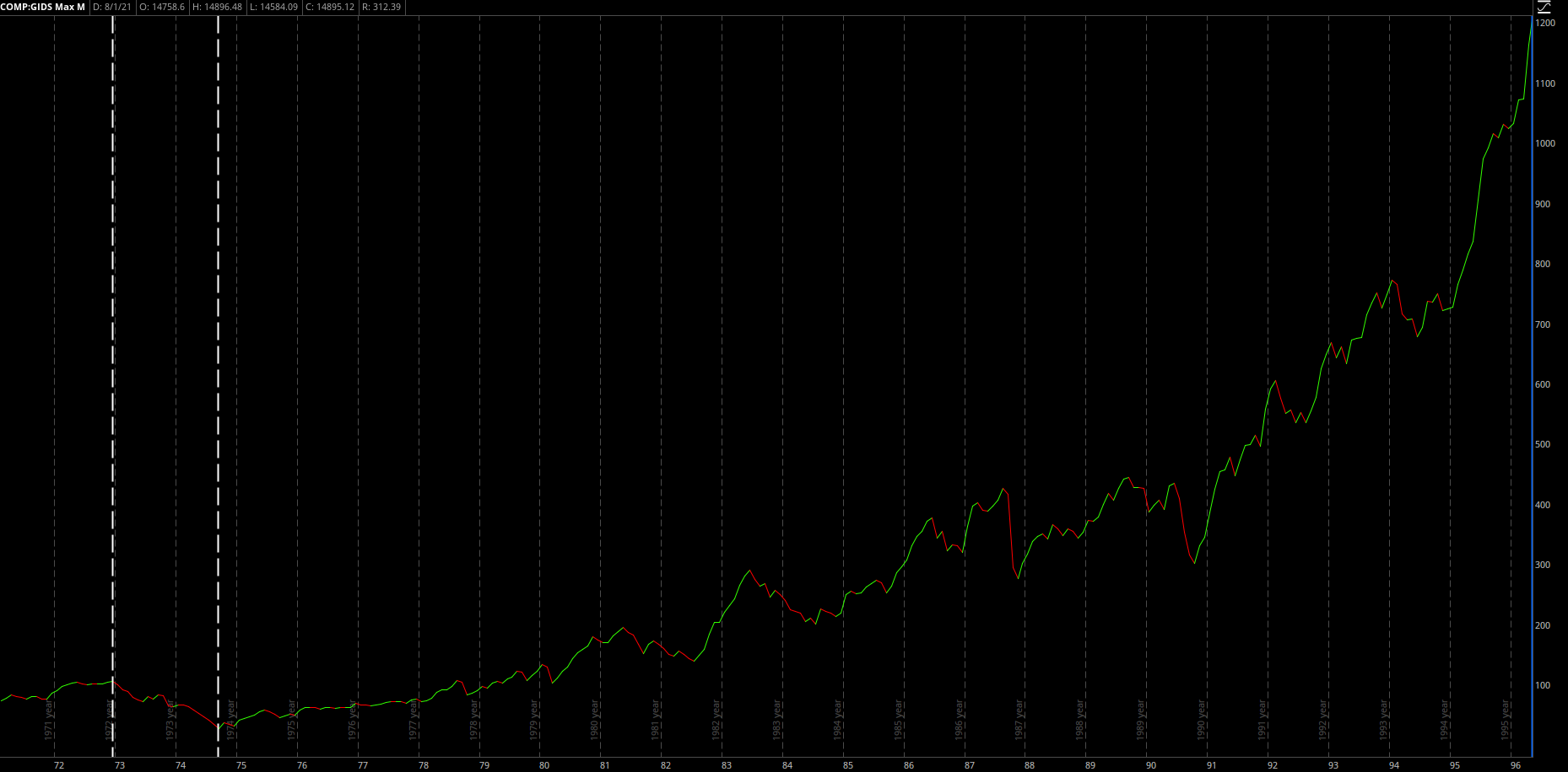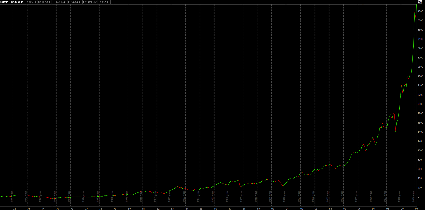 Below is the chart of the Nasdaq Composite, an index that tracks the performance of 3,000 stocks, from February 1971 - May 1996: