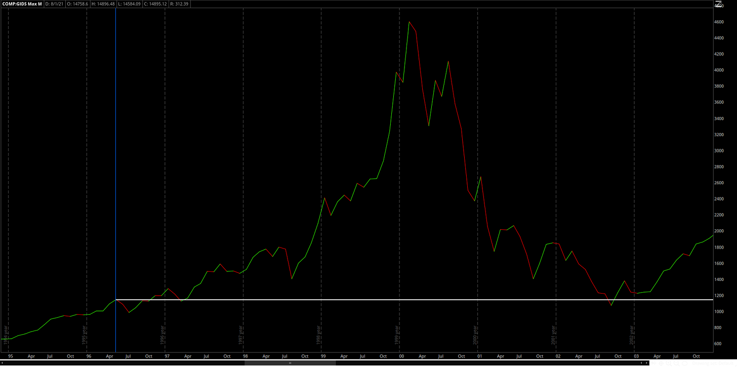 We all know how this story ended, with the dot com bubble bursting in 2000 and declining -78% from peak to trough. It would take 15 years, to June 2015, for the Nasdaq to recover and hit new ATH’s. But here’s the thing: if an investor bought into the Nasdaq in May 1996 (vertical blue line), they practically avoided any losses on their investment.