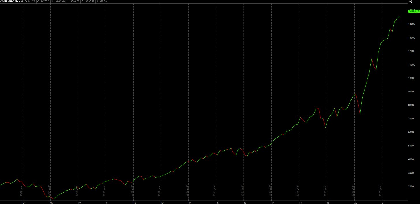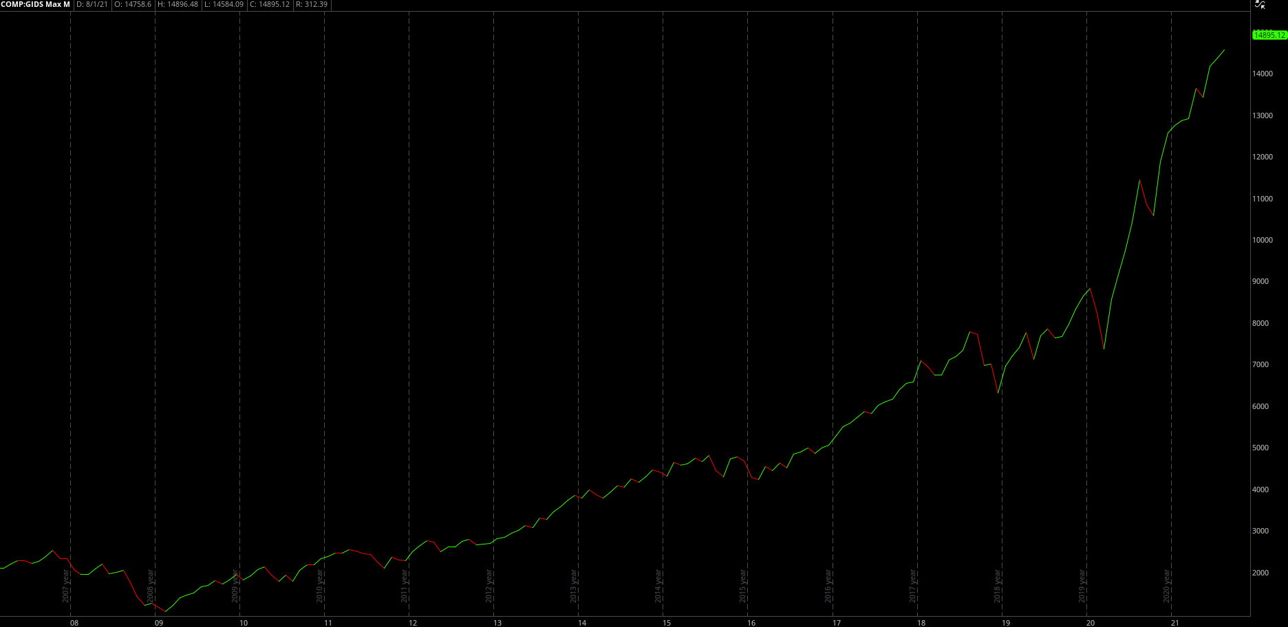 Despite the choppiness of individual tech stocks in February - May 2021, the market has been able to shrug off any concerns about rising yields, potential tax hikes, tighter government regulation, and now the potential resurgence of COVID via the delta variant. After the extensive gains we’ve seen since the COVID crash, as well as the significant gains the market has made since the Great Recession, it’s been easy for the Chicken Little investors to scream that the end is near. Instead of shouting “the sky is falling!”, these investors are screaming that “the stock market is a bubble ready to pop!”. One of the biggest pieces of evidence that they use to support their claim is how the stock market is growing similar to an exponential curve. To their point, it is growing at an exponential pace! Here is an example of a chart of the Nasdaq that I saw posted on Twitter yesterday: