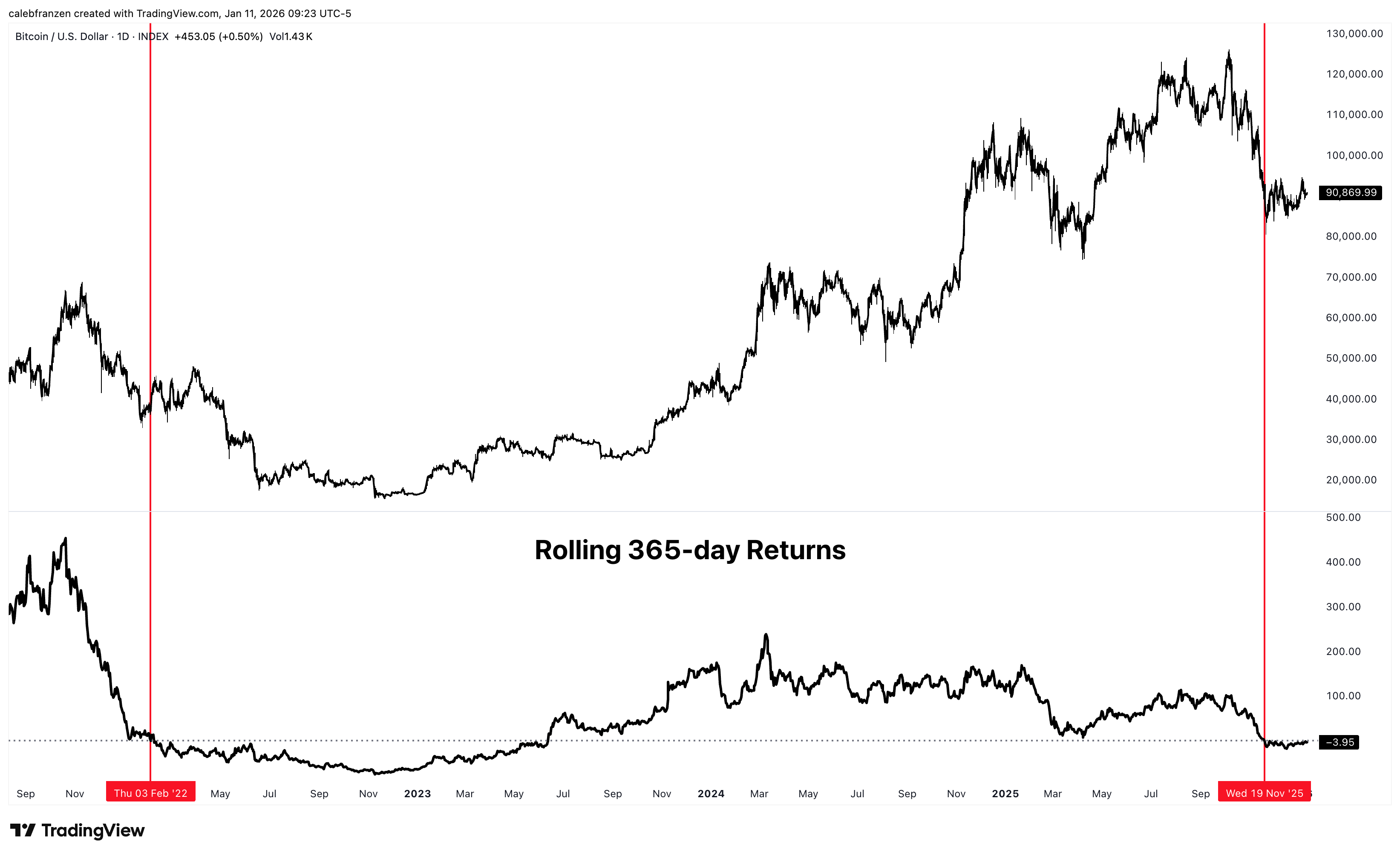 The last time Bitcoin flipped from a positive to negative YoY return was in February 2022, resulting in a significant bear market and a broader risk-off environment.